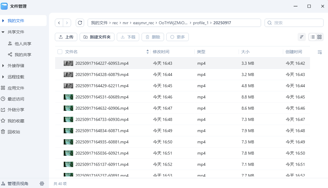 至此,在目录/vol1/1000/rec/nvr下就能看到存储的录像了: