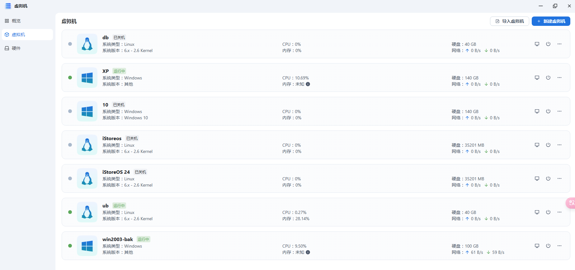还有一个重要的玩法就是虚拟机了。虚拟机里面可以无限配置服务器,可以是windows、linux,也可以是其他系统,同一个系统也可以有各种不同版本。我目前主要配置了四台:一台window2003(游戏服务器)、windows10、用于远程访问家庭同时也是备用主机、iStoreOS用作旁路由、Ubuntu用于研究学习。
