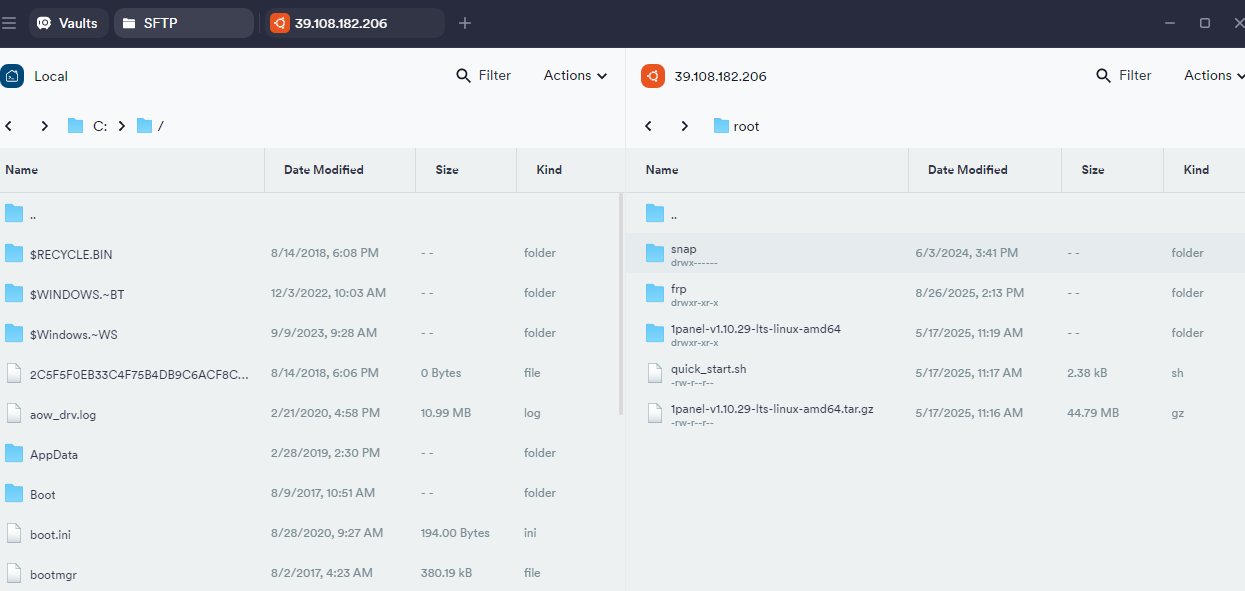 使用SFTP功能把我们下载的frp解压后上传至服务器目录,我一般上传至root下面。