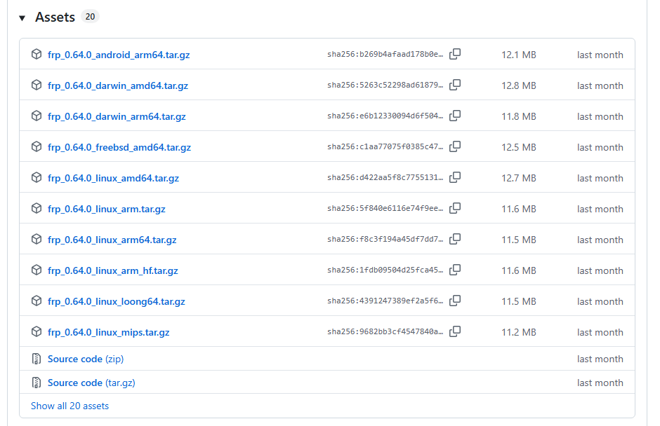 这里下载对应的服务器版本:linux、windows、macos等,同时将下载的frp软件放进云服务器以及需要配置frp的主机中(如果云服务器是linux就下载同版本的linux版本,主机如果是windows就下载windows版本)。